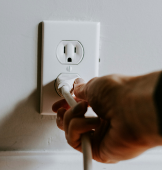 A person wearing a red hard hat and a face mask is working on the ceiling, possibly installing or repairing electrical wiring. The individual is holding tools in their hands and is focused on the task. The wall behind them has partially visible text in large black and red letters.